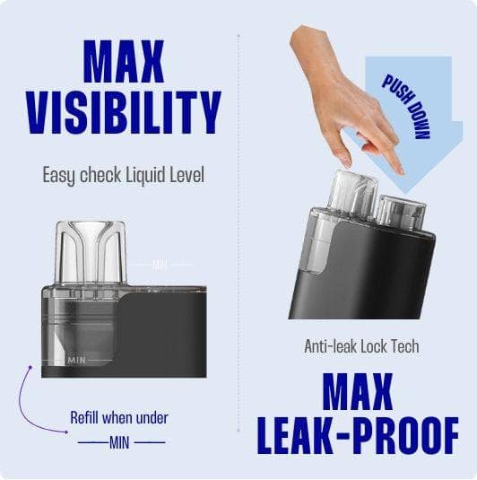 The RELX MaxGo combines innovative anti-leak lock technology with a transparent design for maximum convenience. The anti-leak technology ensures a clean, secure vaping experience without any mess, while the clear design allows you to easily monitor liquid levels. You can refill precisely when it reaches the "MIN" marker, ensuring uninterrupted vaping.